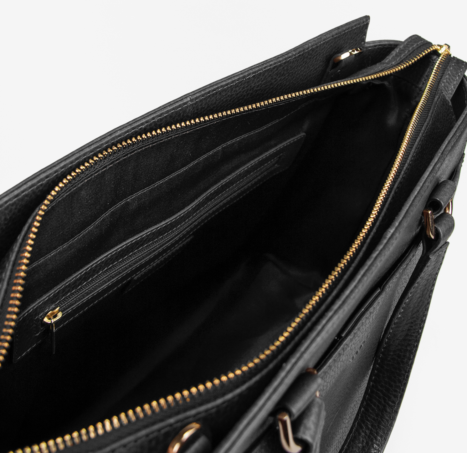 Hånd tasken har et stort hovedrum, hvori der er en lynlåslomme og to stiklommer. Både foran og bagpå har tasken en lomme, som lukkes med en trykknap. Tasken har en bred fast bund, som gør at den kan stå selv. Tasken har to hanke og en lang aftagelig justerbar rem.