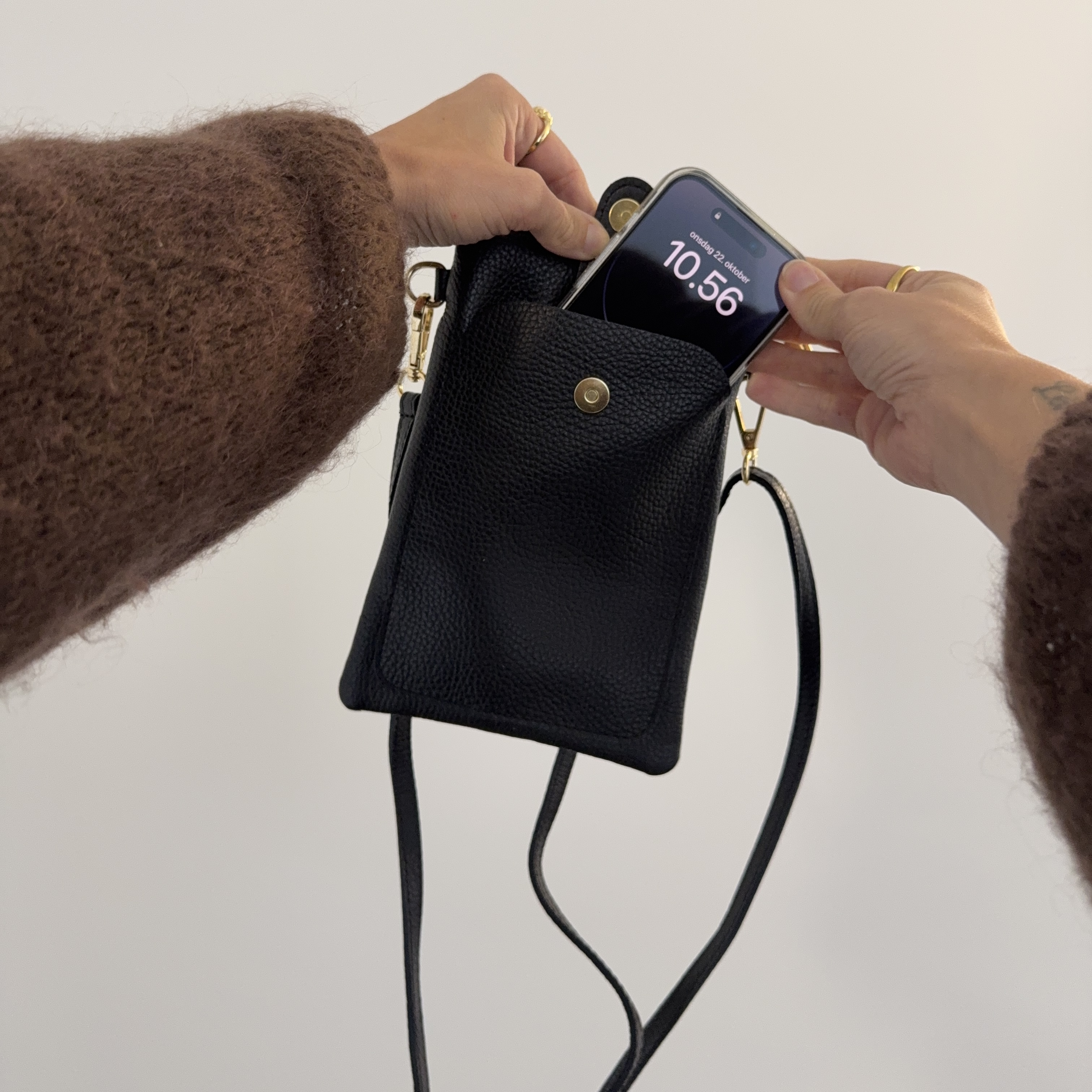 Mobiltasken har en lang aftagelig justerbar rem og fås i farverne: Sort, cognac, mørk beige, grøn, rosa og beige.