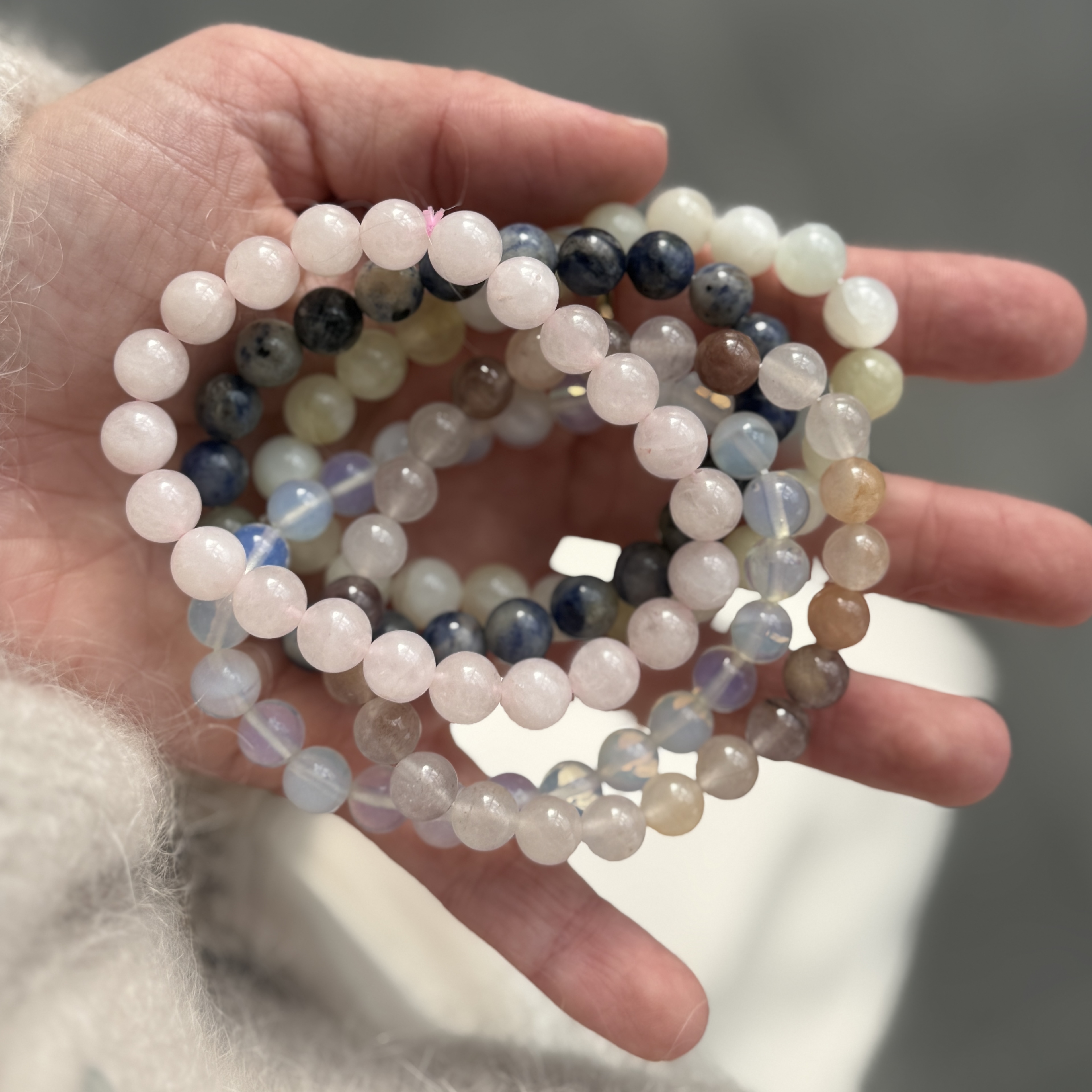 Armbånd med mineral perler i mange forskellige sten som kvarts, jade, agat, labradorit og andre flotte halvedelsten.