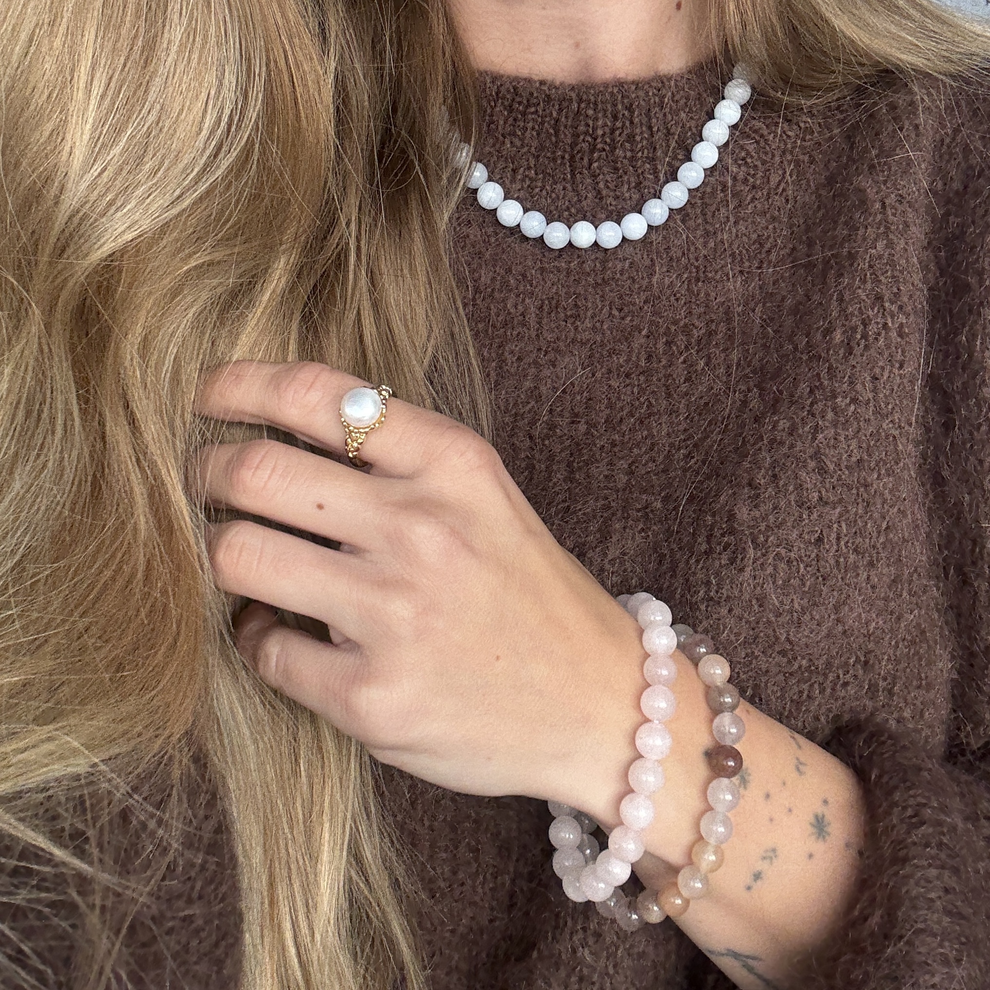 Armbåndende er runde blanke perler af halvedelsten på en elastik snor, der gør det let at tage dem af og på og behagelige at have på.