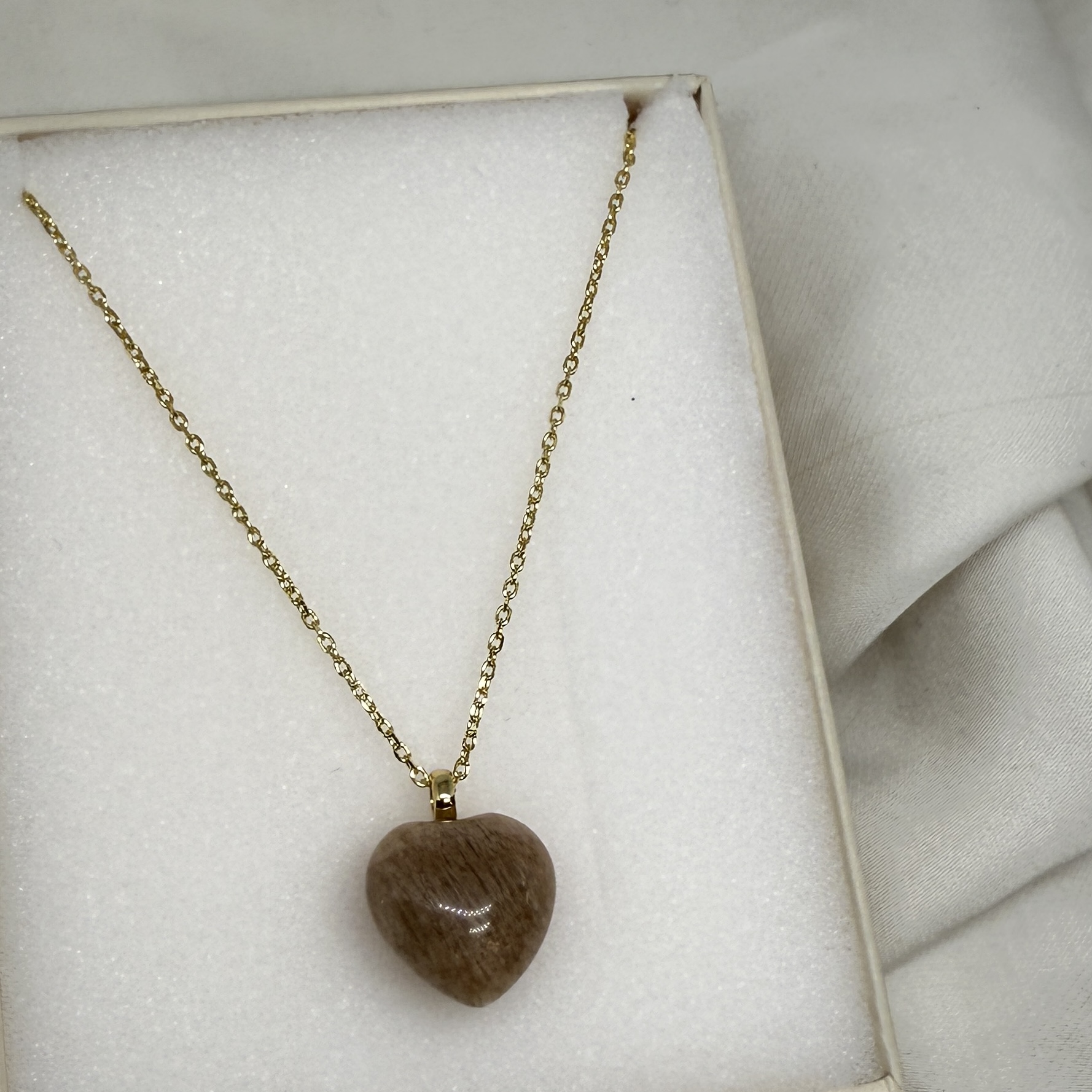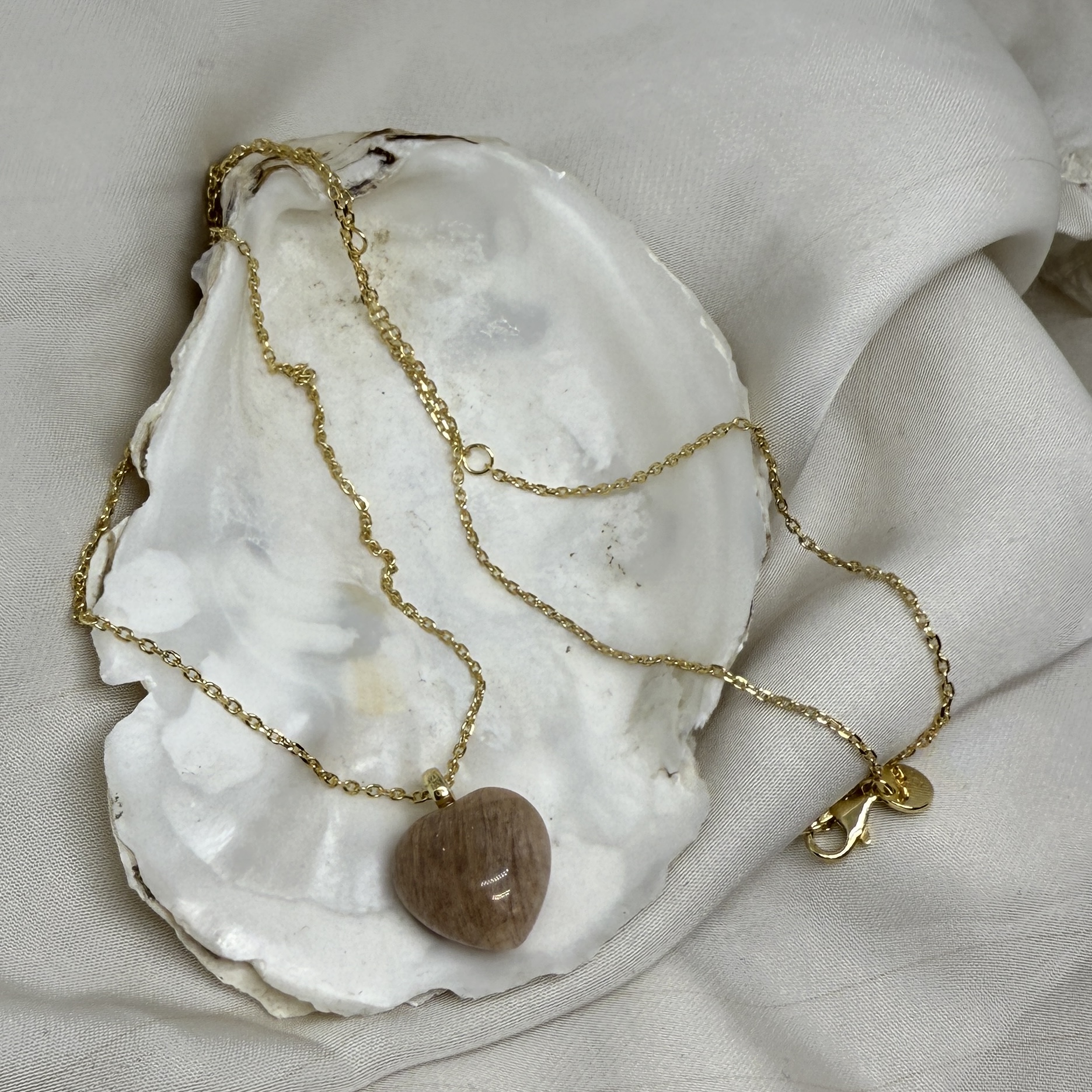 Hjerte vedhæng i sunstone der har en flot beige rosa nuance, der helt tilpasser sig farven i tøjet du har på.