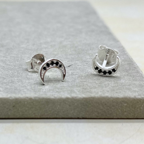 Vores moon ørestikker er i sterling sølv med små måner & sorte zirkonia..