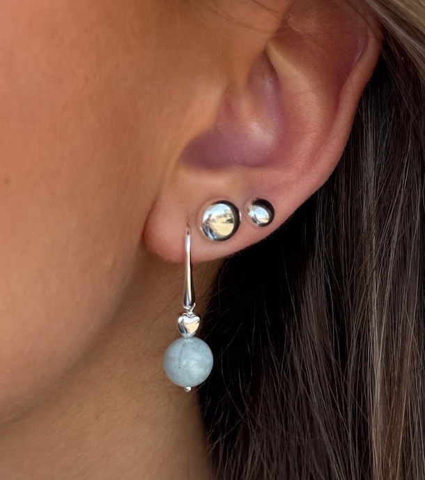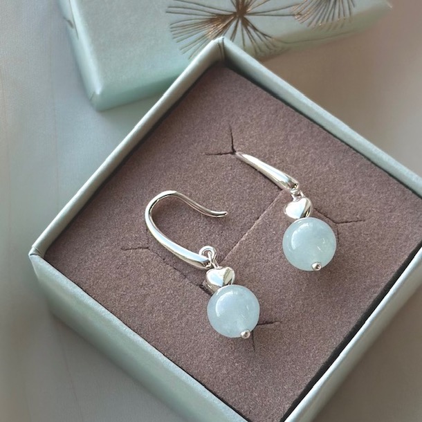 Smukke og elegante ørekroge i et stilrent design vedhæng af en lys blå morganit og et lille hjerte.