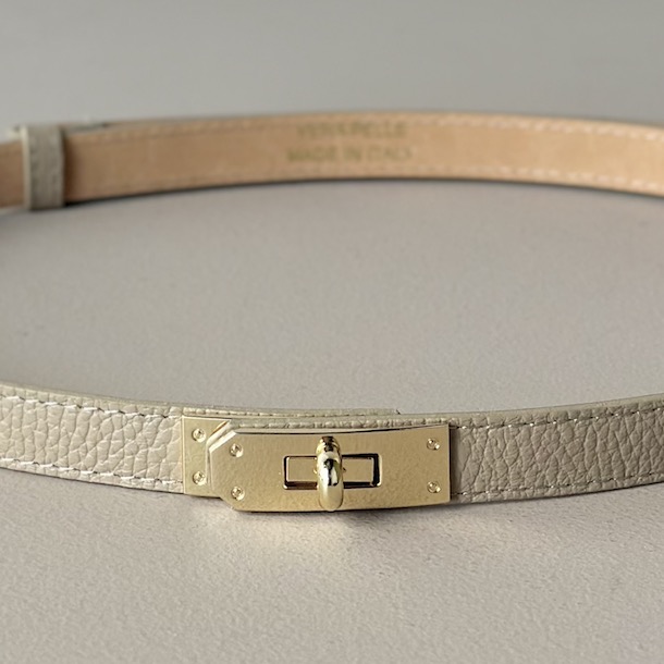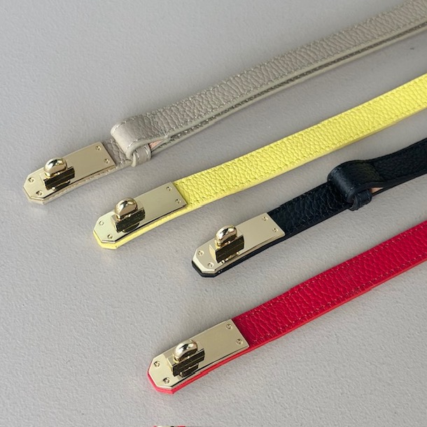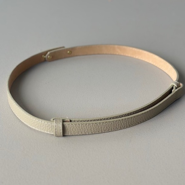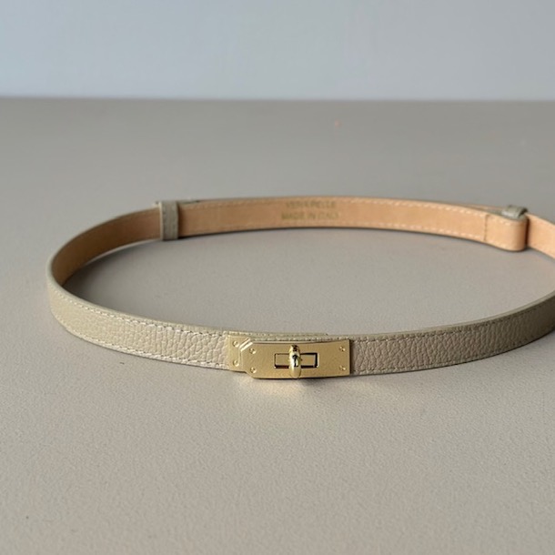 Denne fine bælter har den detalje, at den kan justeres bagpå ved at trække i bæltet. Bæltet fås i beige, sort, rød og gul og er 1,8 cm bred. Bæltet har en fin dreje spænde foran.