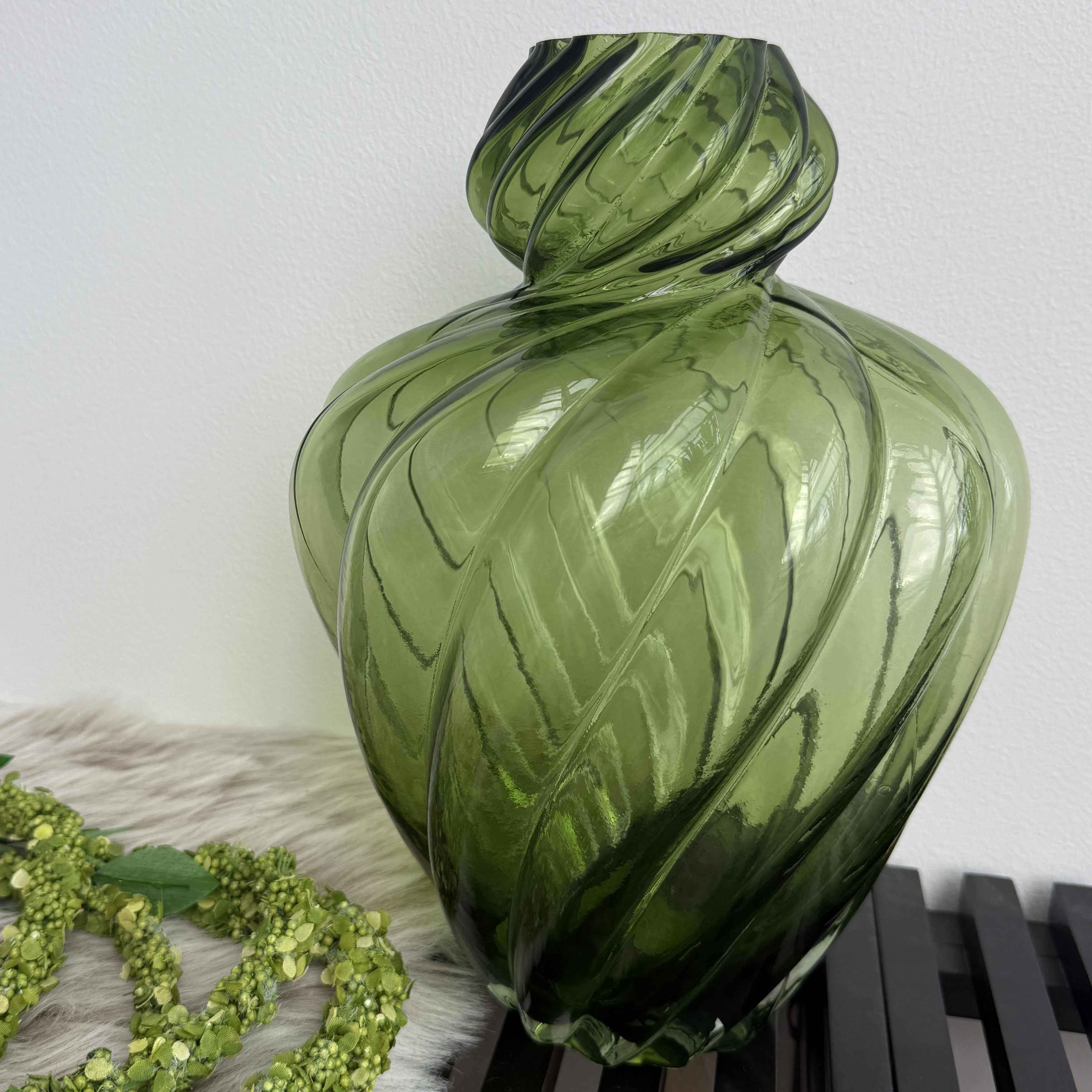 Denne smukke vase er i grøn glas med snoede striber. Vasen kan sagtens stå alene uden blomster, men er super fin med nogle af vores kunstige blomster eller grene i.
