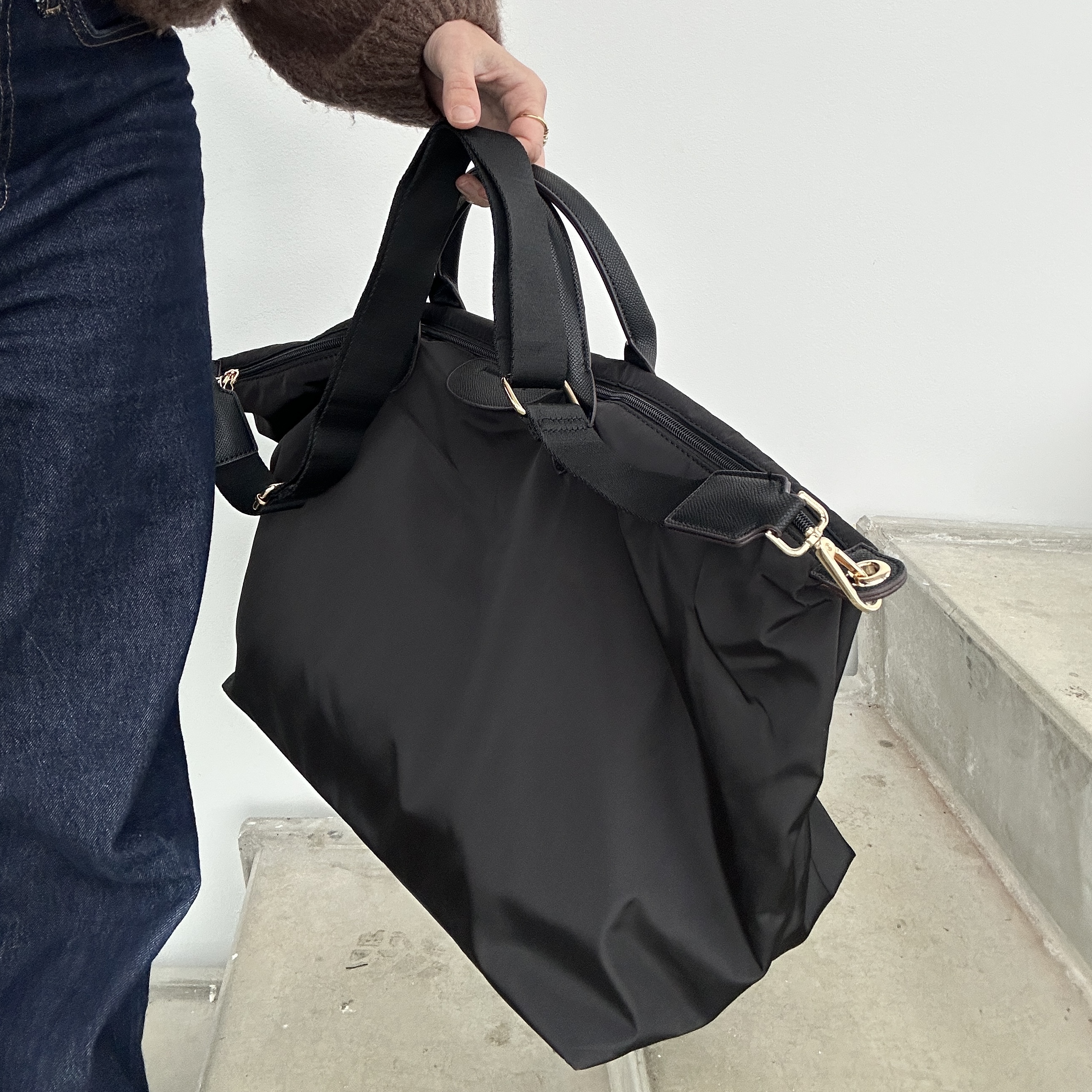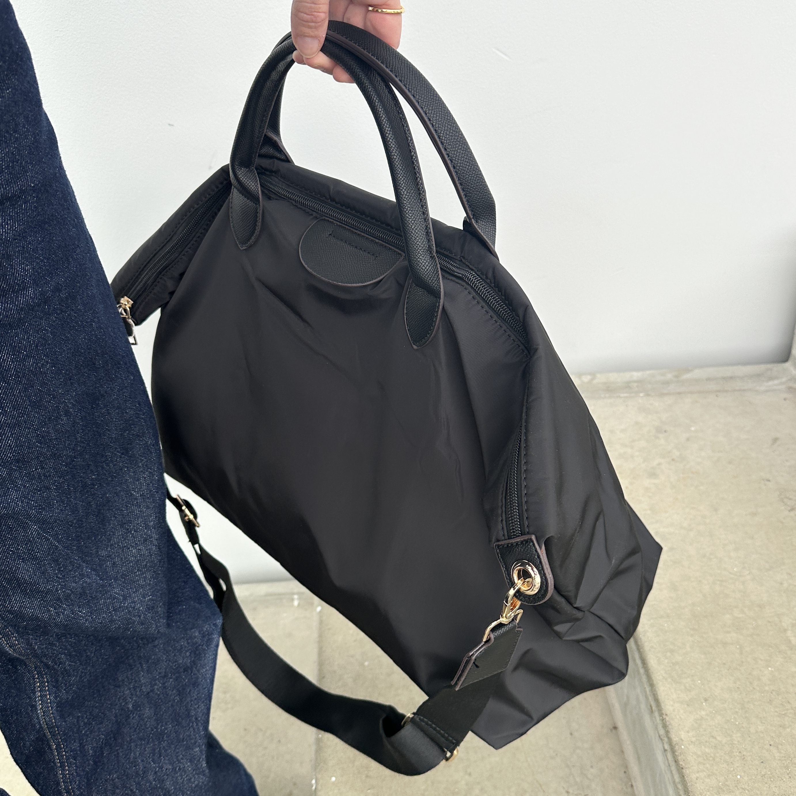 Weekendtasken har to hanke og en lang aftagelig justerbar rem.