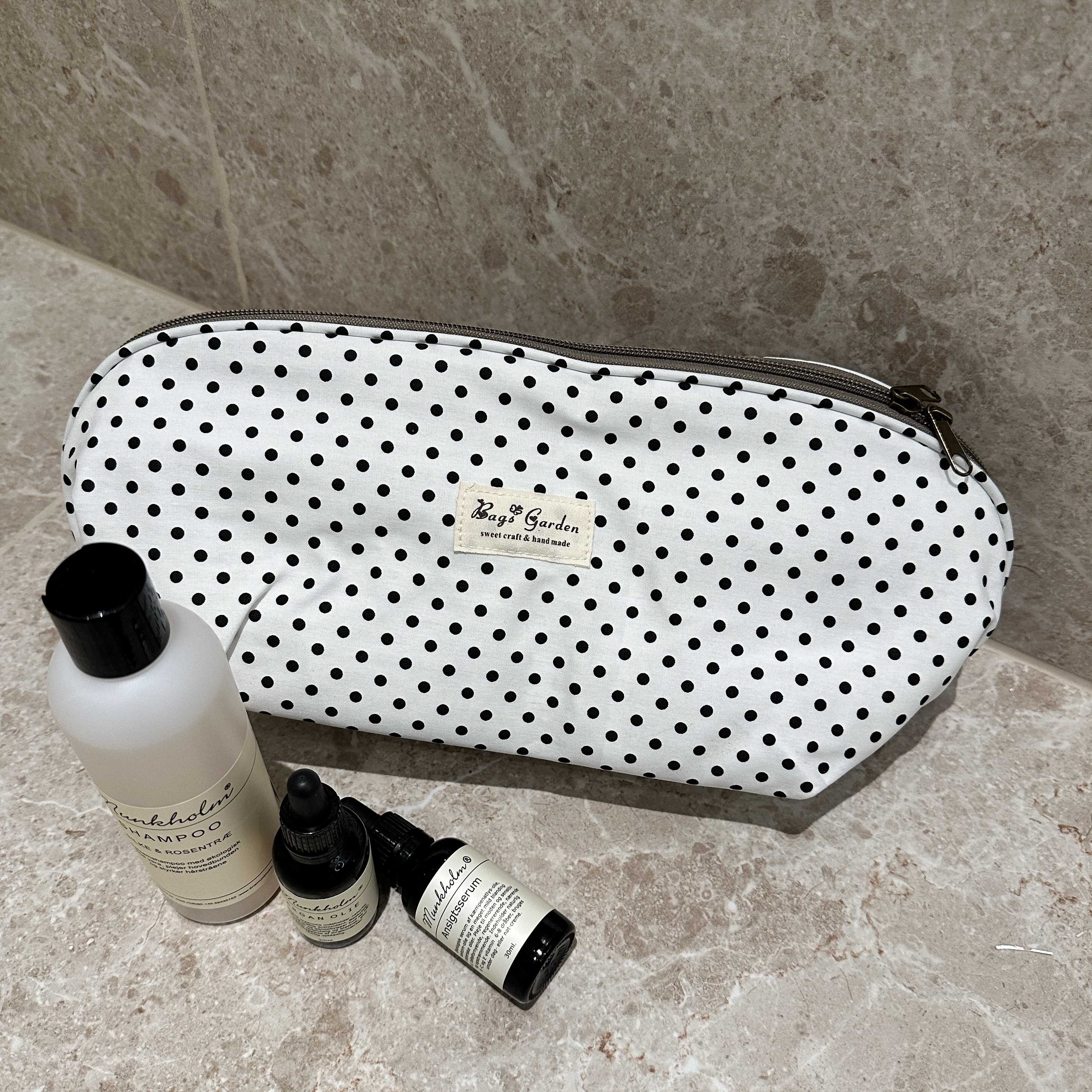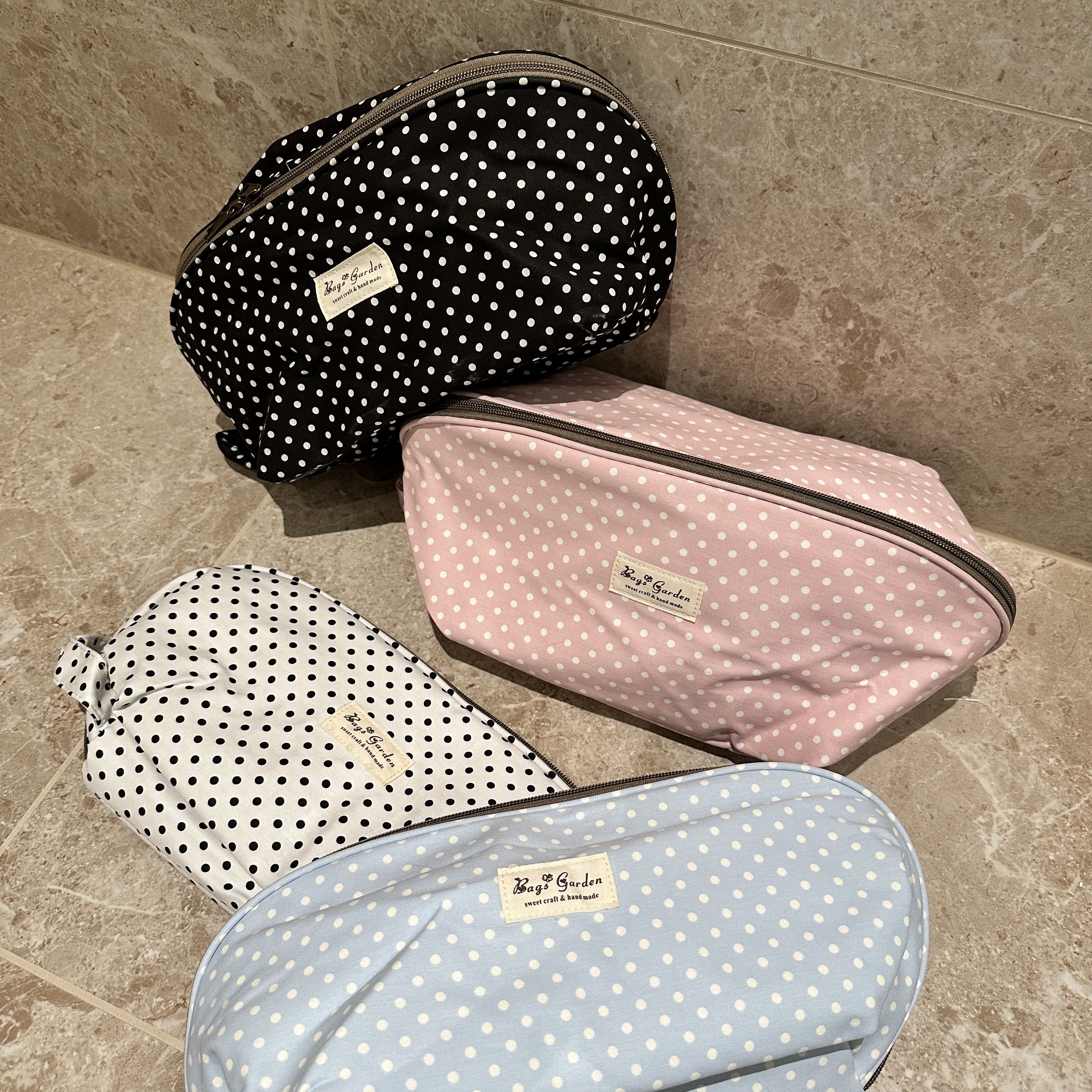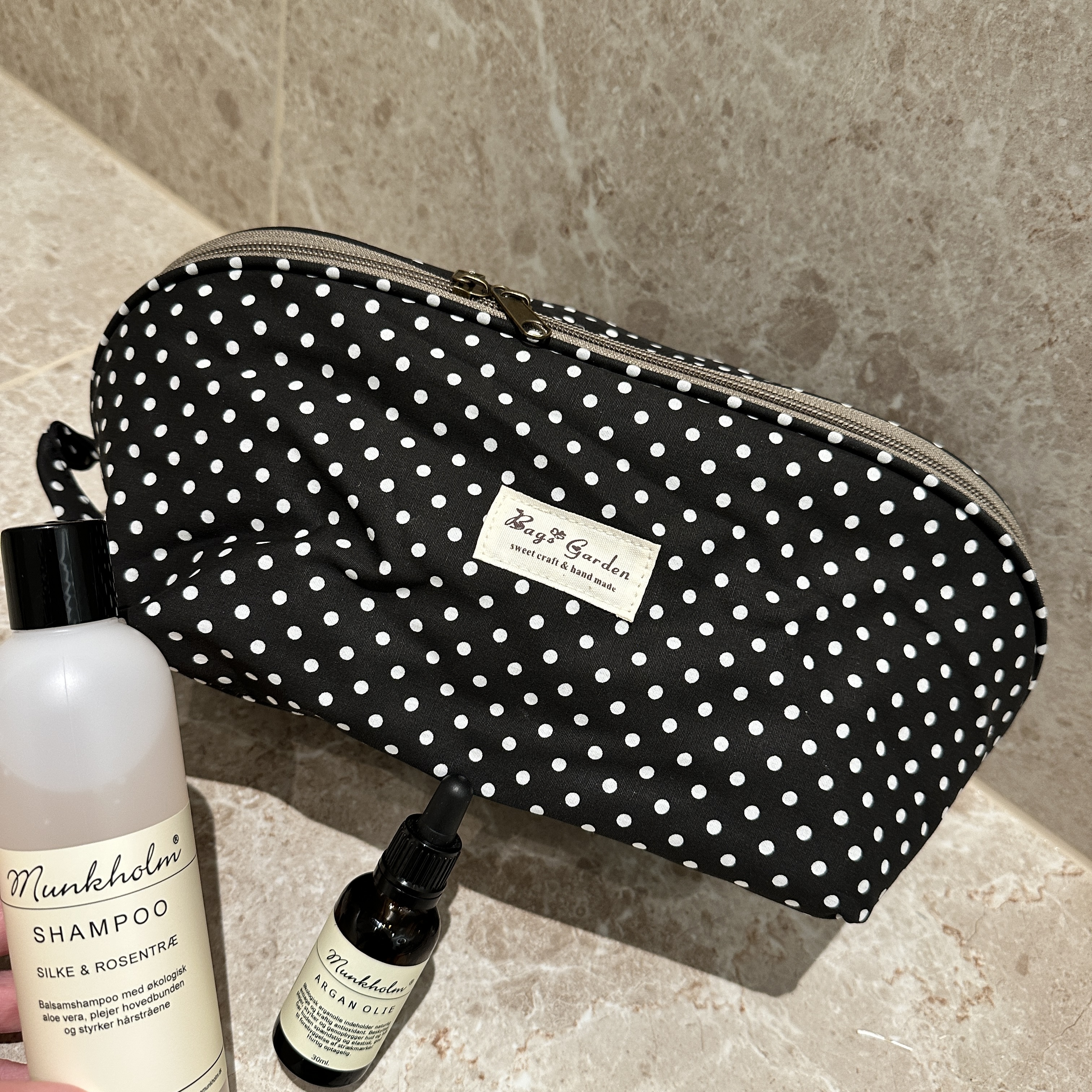 Toilettasken fås i sort, lyseblå, rosa og hvid med prikker.