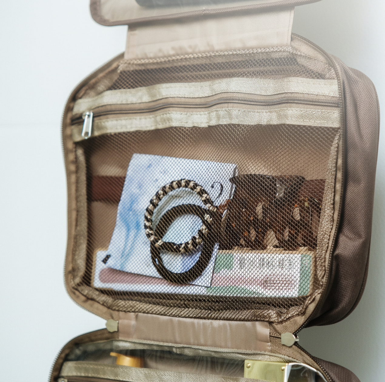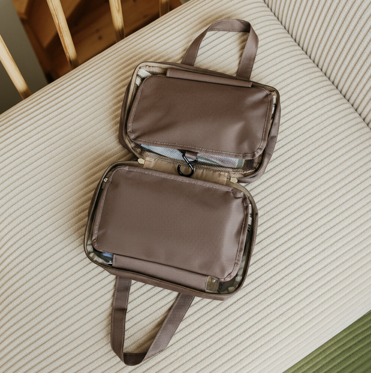 Smart rejsetoilettaske i brun, med mange rum og ophæng.