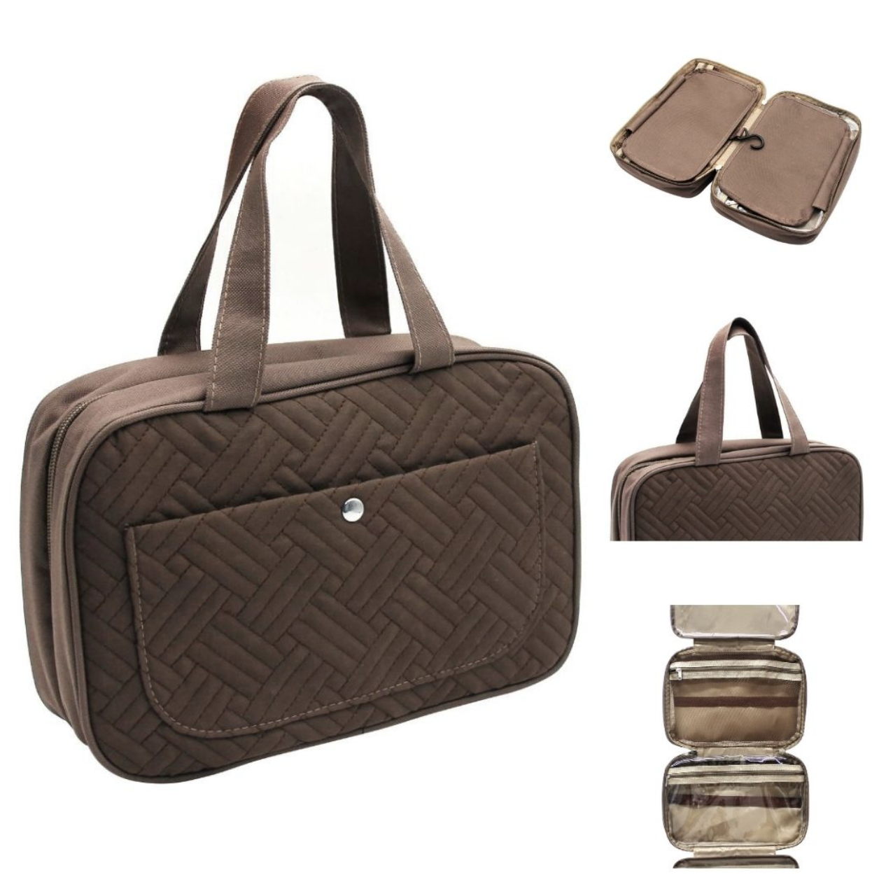 Farve: BrunMål: 28 cm × 20 cm × 14,5 cmFunktioner:Kan foldes helt udKan hænges op med krogFlere rummelige lommerGennemsigtige rum for hurtigt overblikPerfekt til rejse, makeup, medicin, opbevaring og organisering - eller bare derhjemme