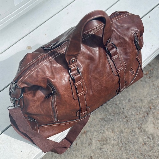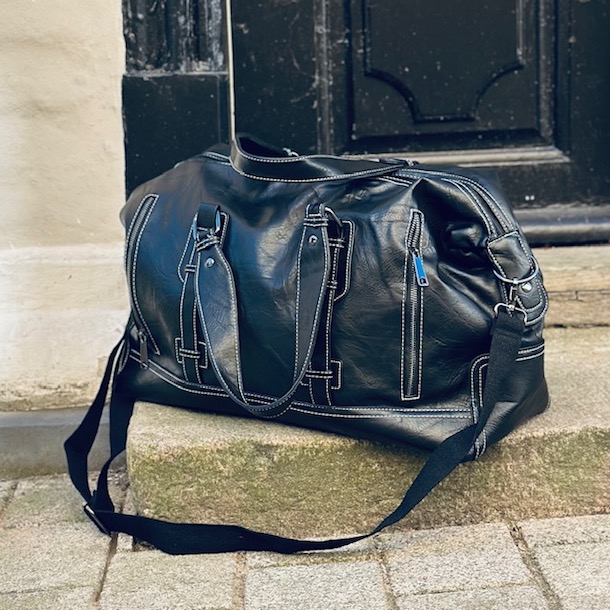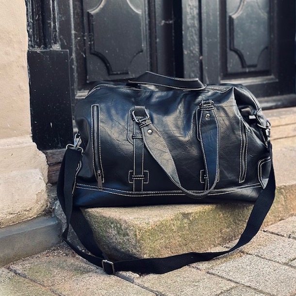 En rigtig fin weekendtaske i sort og kaffe med hvide syninger.