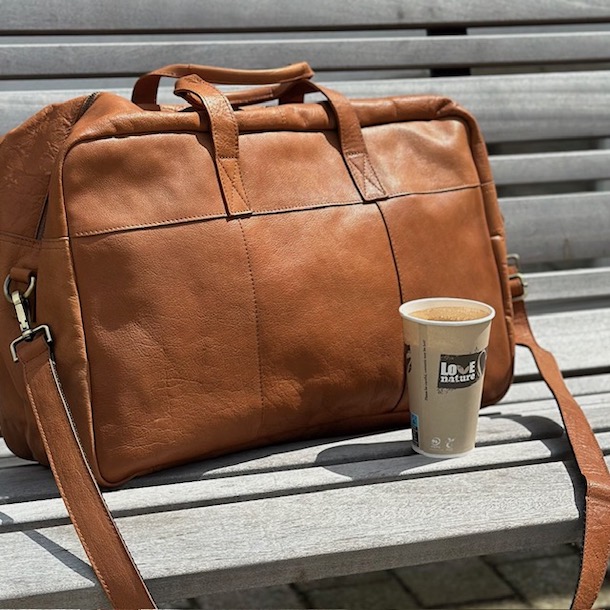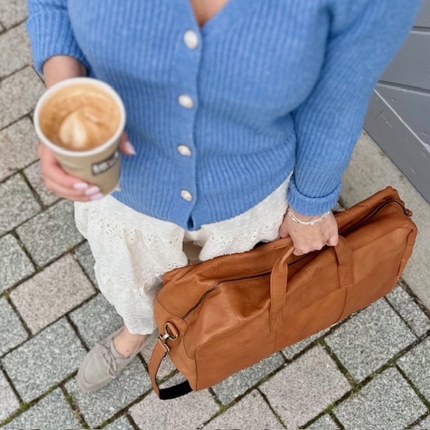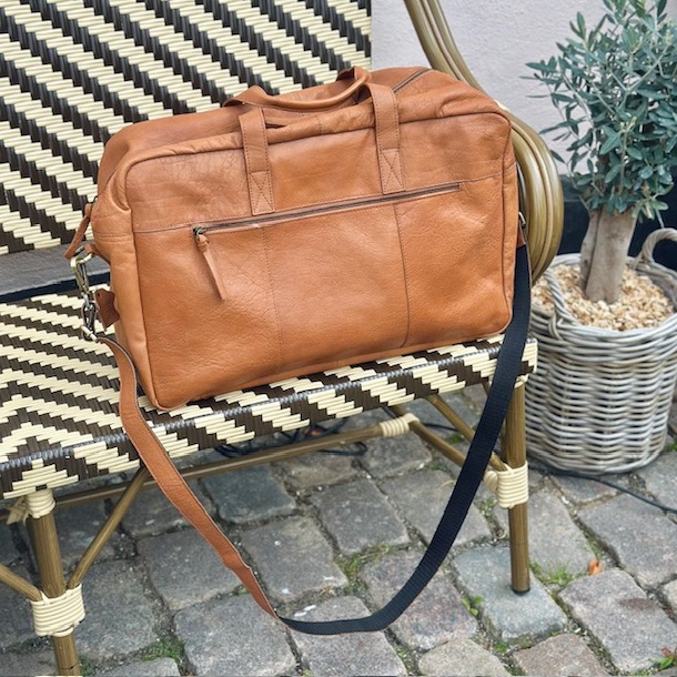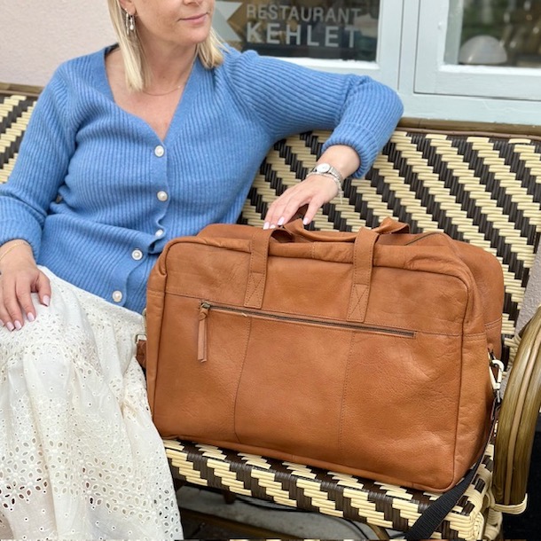 Weekendtasken har to hanke og en lang aftagelig justerbar rem og fås i sort og cognac.