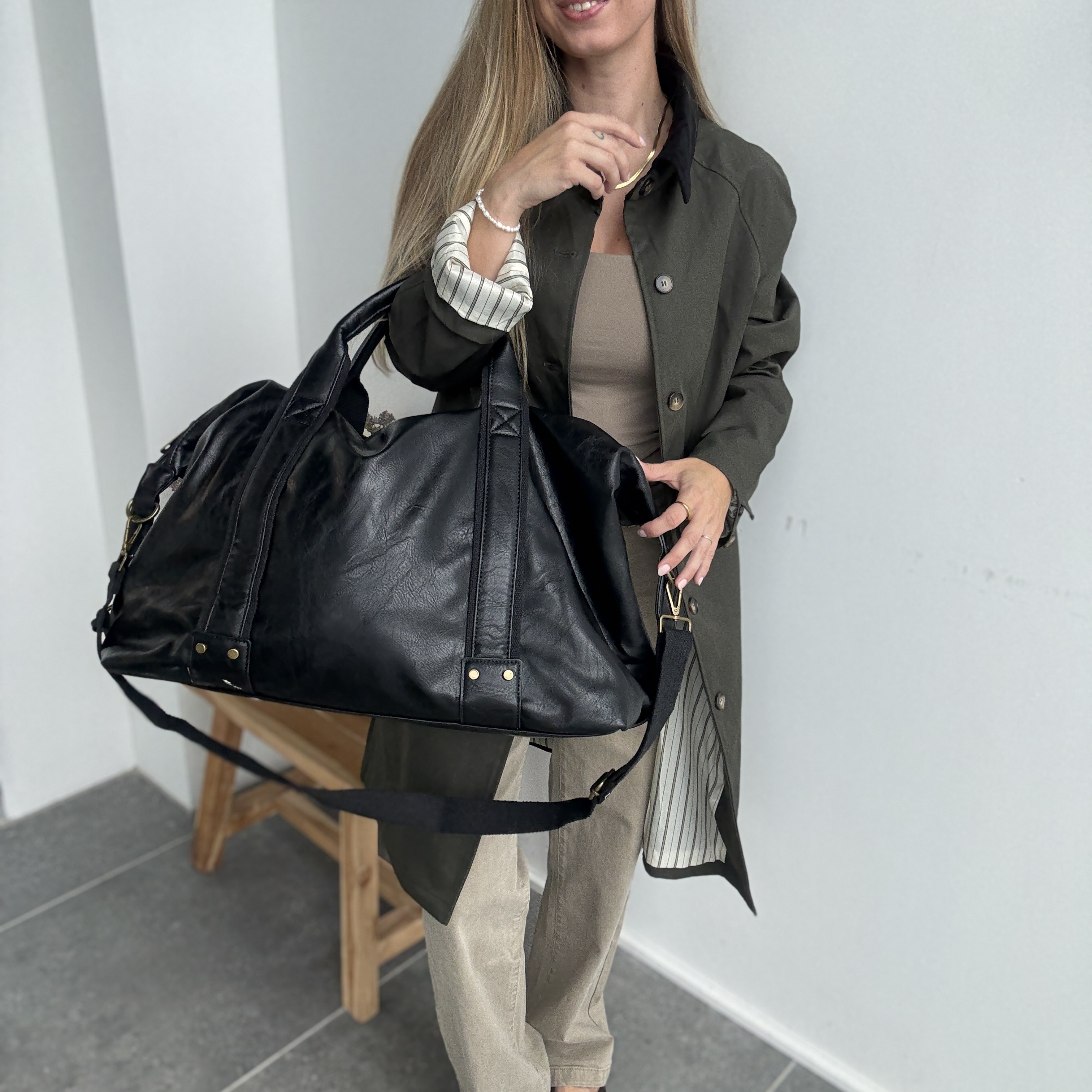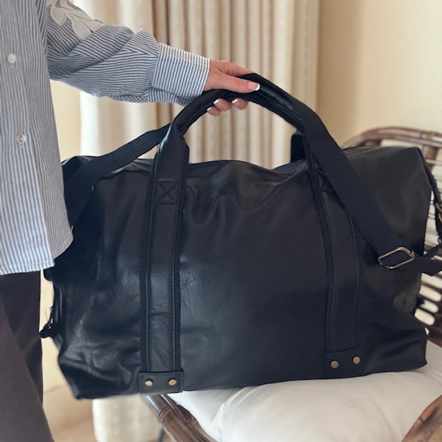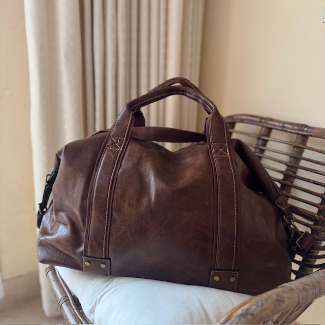 Weekendtasken har to hanke og en lang aftagelig justerbar rem i kanvas og fås i brun og sort. Weekendtasken har synlige stikninger.