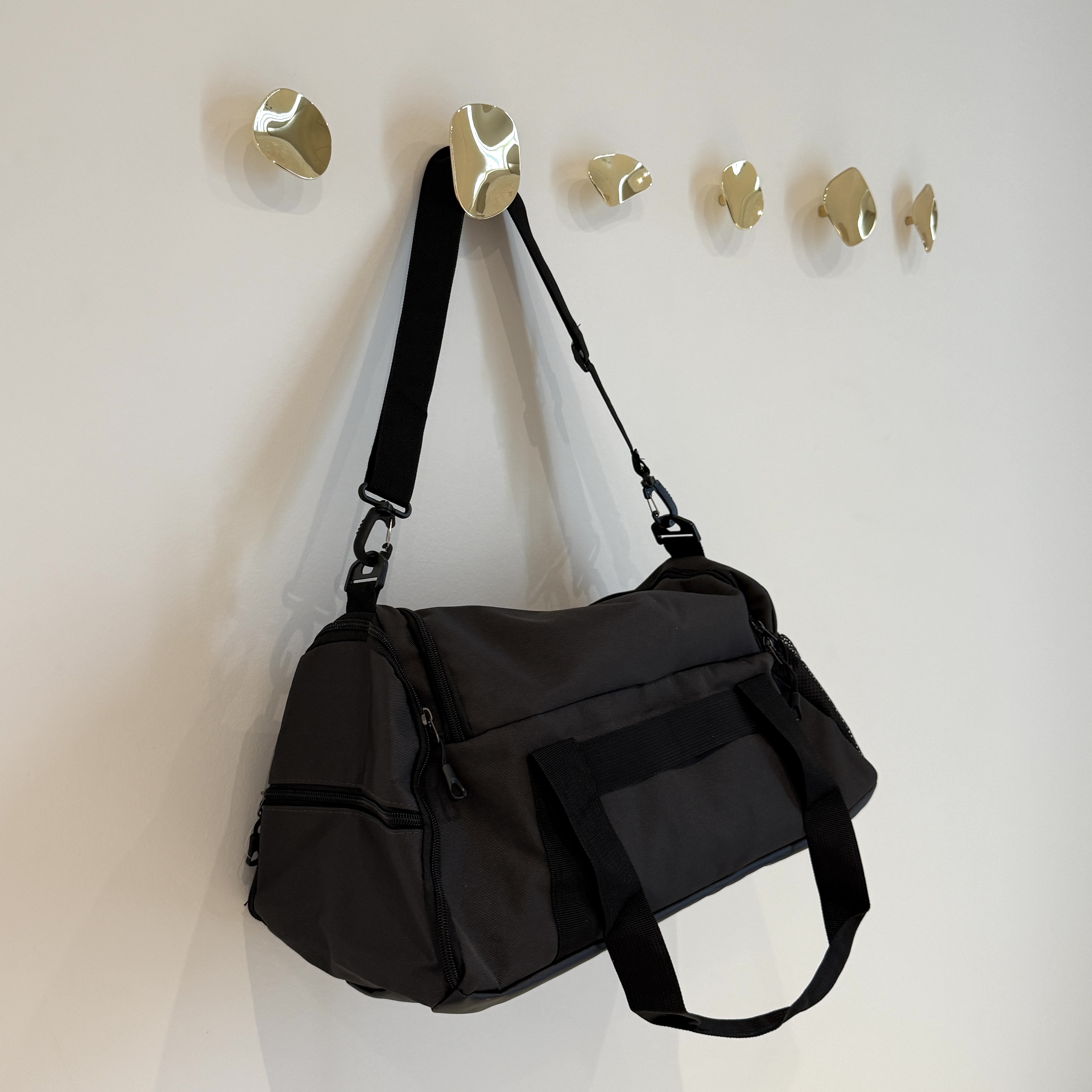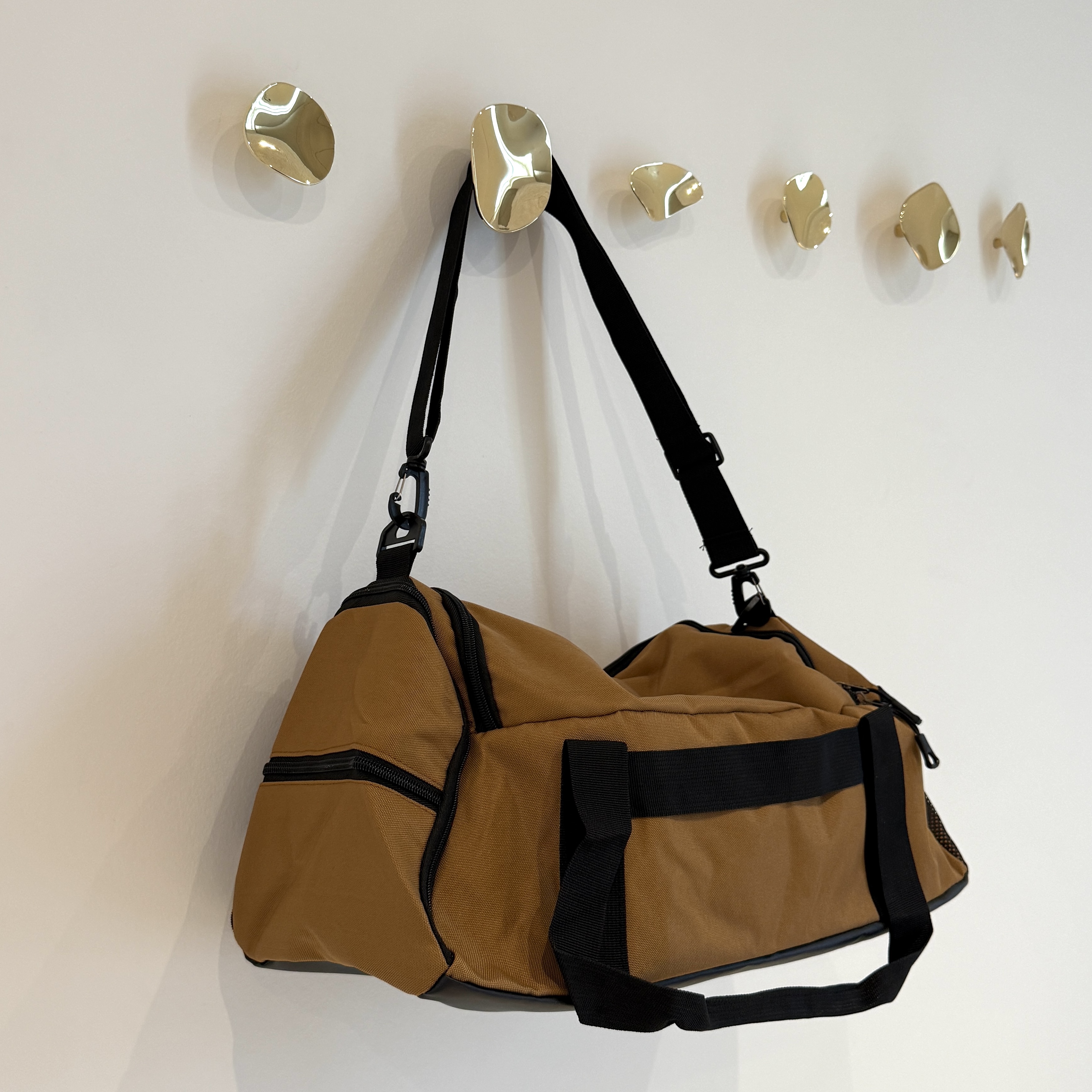 Sportstasken har to hanke og en lang aftagelig justerbar rem og fås i sort og cognac.